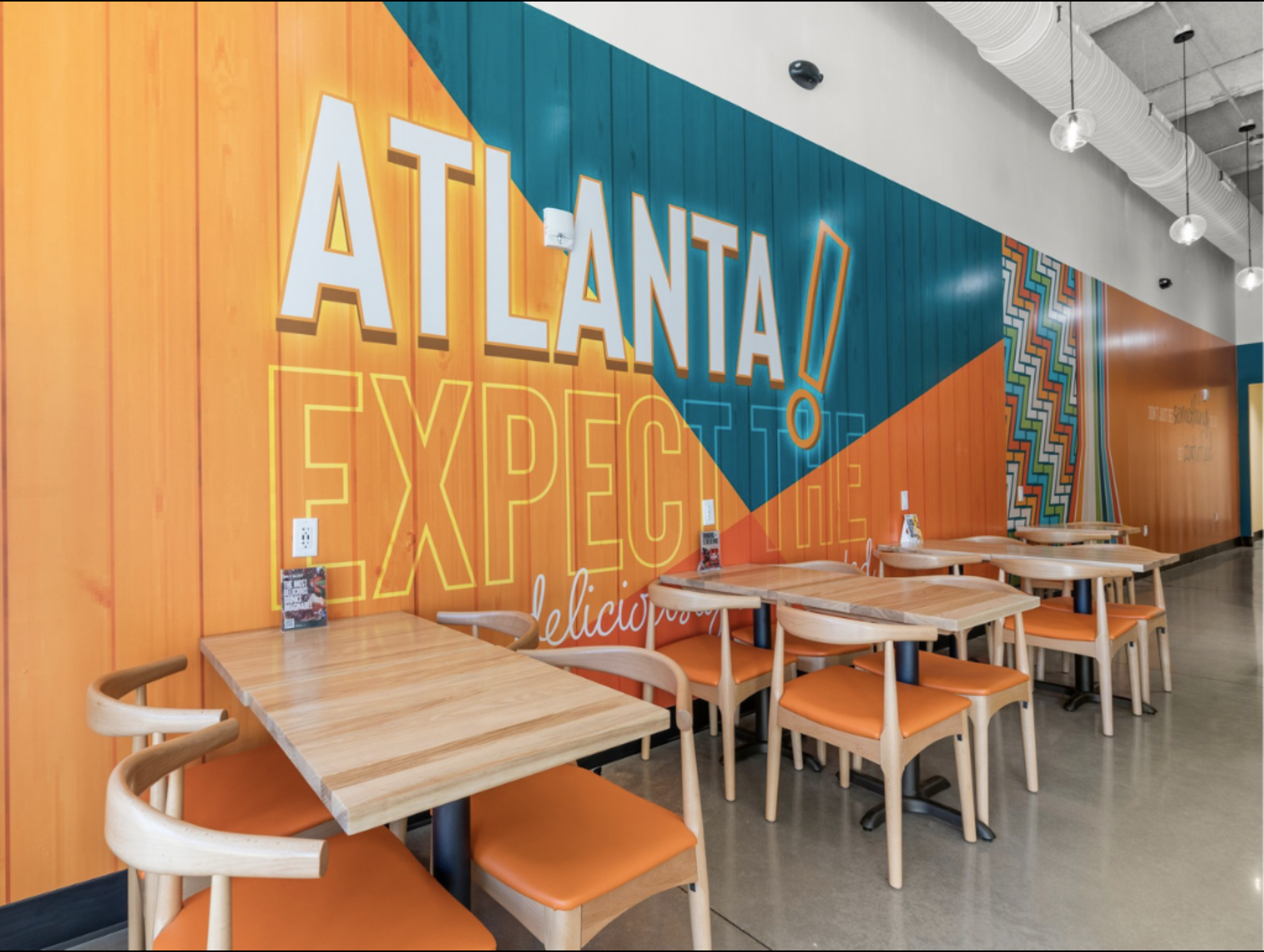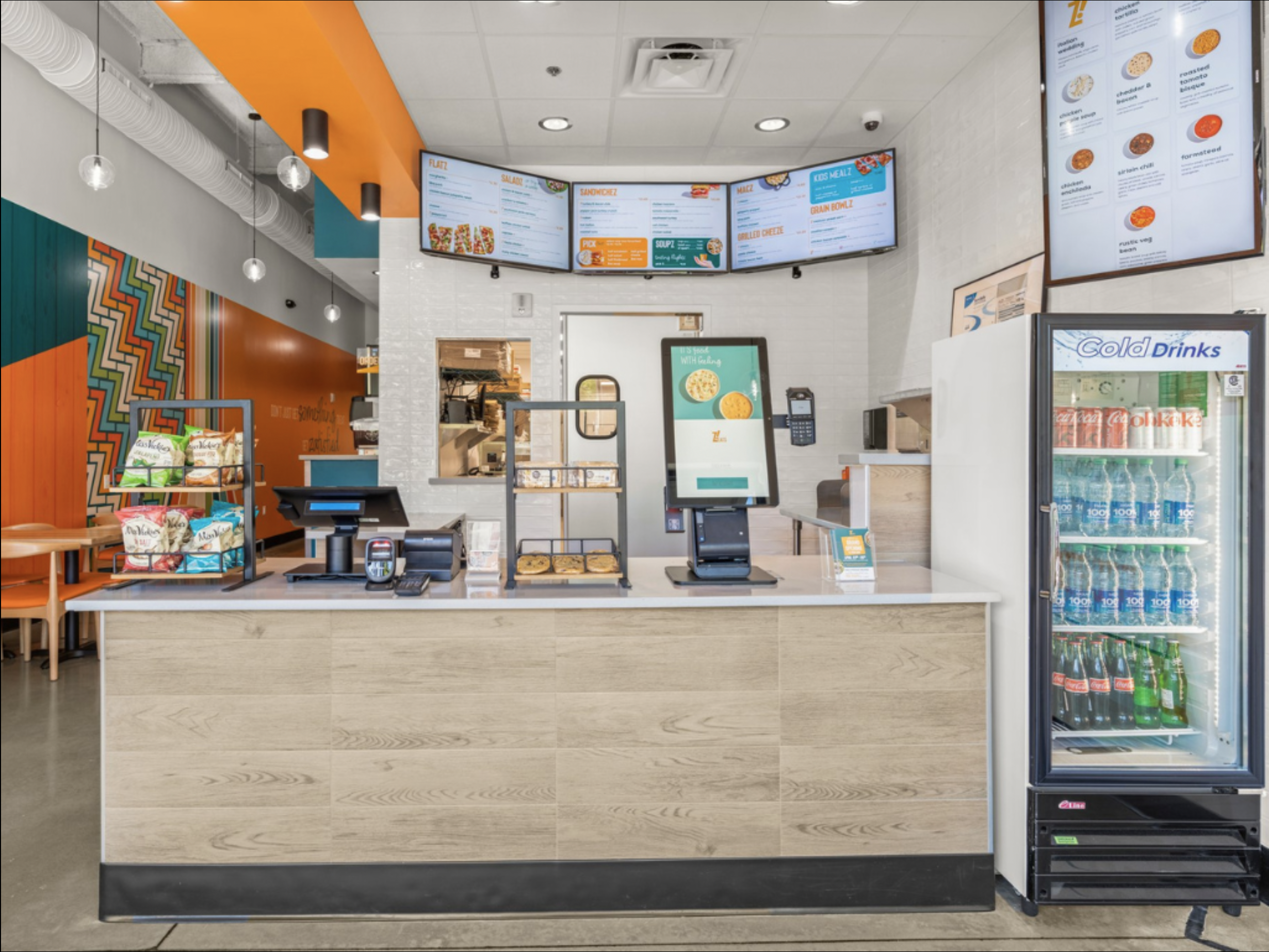 Zeats interior with wooden service counter and modern accent wall